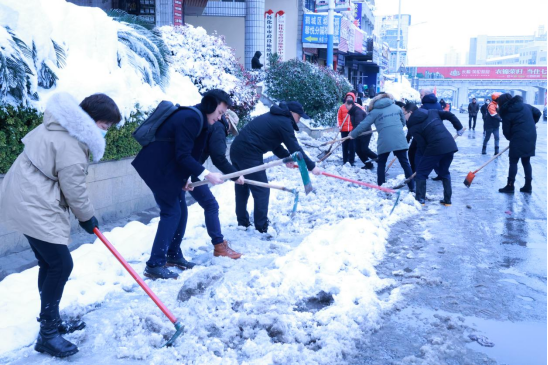工作人員們發(fā)揚(yáng)不怕苦、不怕累、不畏嚴(yán)寒的精神,分工合作,鏟的鏟,掃的掃,干得熱火朝天,很快厚厚的積雪就被大家清理干凈了。大家在除雪的同時(shí),還不斷提醒路人“小心地滑,注意安全”。