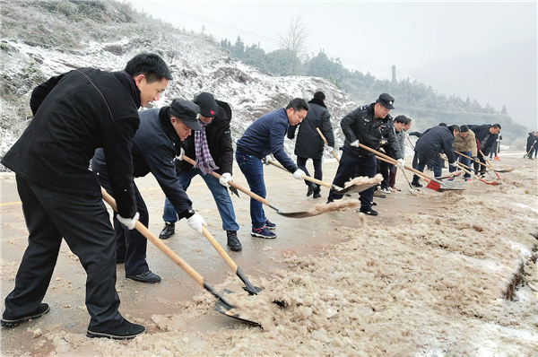 1月27日上午,鶴城區(qū)黃金坳鎮(zhèn)在職黨員干部50余人,來到209國道黃金坳鎮(zhèn)仇家村路段對冰凍路面進行鏟雪破冰,保障來往車輛及群眾安全通行。(本報記者 史琴 通訊員 肖鵬 攝)