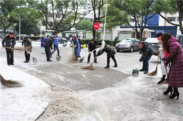 1月26日,市第一人民醫(yī)院的黨員志愿者與醫(yī)務人員在醫(yī)院內(nèi)鏟除冰雪,確保行人安全通行。 (曾悅 攝)