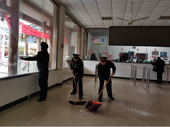 圖2  黨員志愿者們正在打掃汽車站售票大廳