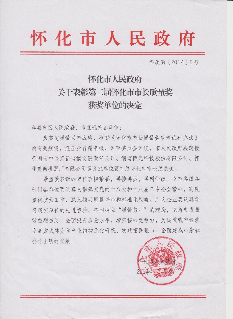自2011年頒發(fā)首屆懷化市市長(zhǎng)質(zhì)量獎(jiǎng)以來(lái),全市各級(jí)各部門,各企業(yè)迅速掀起了質(zhì)量興市熱潮,廣泛開(kāi)展了學(xué)習(xí)貫徹落實(shí)以《卓越績(jī)效評(píng)審準(zhǔn)則》國(guó)家標(biāo)準(zhǔn)和市內(nèi)外先進(jìn)企業(yè)成功質(zhì)量管理經(jīng)驗(yàn)為重點(diǎn)的質(zhì)量強(qiáng)市活動(dòng),我市質(zhì)量工作得到了很好的發(fā)展,為進(jìn)一步推進(jìn)質(zhì)量興市戰(zhàn)略,2013年我市根據(jù)《懷化市市長(zhǎng)質(zhì)量獎(jiǎng)試行管理辦法》的有關(guān)規(guī)定,經(jīng)企業(yè)自愿申報(bào)、評(píng)審委員會(huì)評(píng)議,市人民政府決定,授予湖南中鐵五新鋼模有限責(zé)任公司、湖南恒光科技股份有限公司、懷化建南機(jī)器廠有限公司等3家單位第二屆懷化市市長(zhǎng)質(zhì)量獎(jiǎng)。