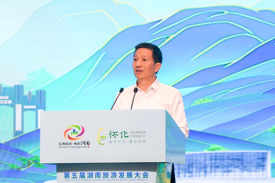 ▲9月17日上午,第五屆湖南旅游發(fā)展大會開幕,市委書記許忠建作懷化文化旅游推介。(懷化日報全媒體記者 楊智偉 攝)