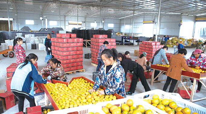 麻陽冰糖橙熱銷,麻陽高村鎮(zhèn)陶伊村麻陽三農(nóng)兄弟公司的加工倉庫內(nèi),果農(nóng)正在包裝冰糖橙。 (記者 陳湘清 攝影)