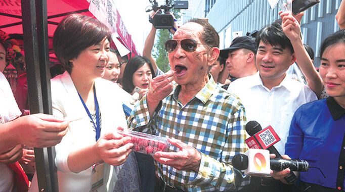 中國工程院院士、“雜交水稻之父”袁隆平品嘗新上市的靖州楊梅后,連夸好吃。(記者 陳湘清 攝影)
