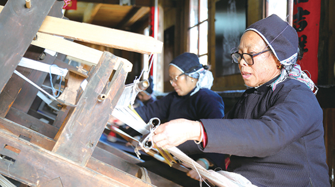 侗族織娘正在手工紡織梭說侗錦。(記者 劉田 攝影)