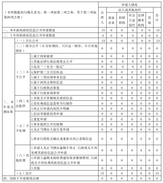 全年收到15信息公開申請,均已按時辦結(jié)。在行政復(fù)議、訴訟方面,也未收到有關(guān)政府信息公開的行政復(fù)議申請,也未發(fā)生關(guān)于政府信息公開的行政訴訟案件。