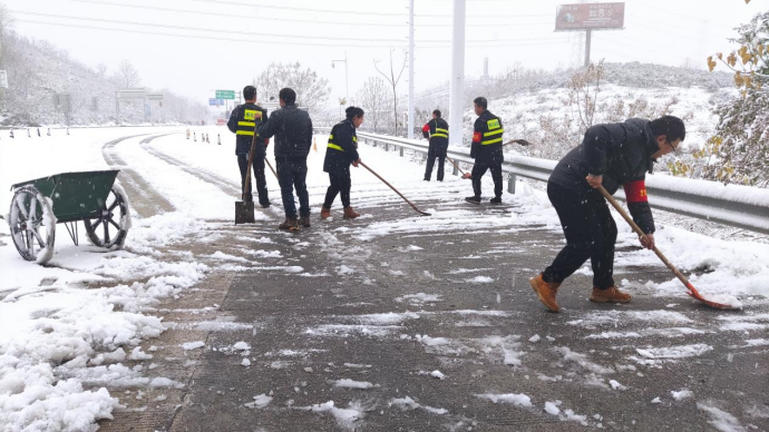 2021年年底,一場大雪襲來,再次拉近了高速“路燈”與防疫“大白”之間的關(guān)系。冰雪阻路,“大白”們果斷換下防護服,化身“除冰衛(wèi)士”,與收費站工作人員共同除冰保暢,在冰雪中共同描繪出最溫暖人心的畫卷。