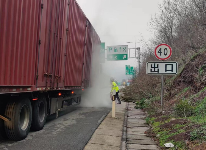 當日下午,巡查人員黃海波、王銘荃駕車由懷化往吉首方向巡查,巡至南往北方向K2158+600(懷化服務(wù)區(qū)入口附近)時,發(fā)現(xiàn)前方行車道上一輛大貨車右前輪正冒著黑煙,且有刺鼻的輪胎燃燒的焦煳味,而該車駕駛?cè)撕敛恢椋择{車行駛,極易引發(fā)全車自燃事故。