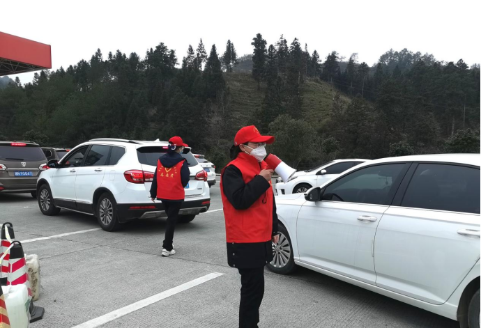 (“路燈”志愿者在通道服務(wù)區(qū)加油站引導(dǎo)車輛有序通行。)