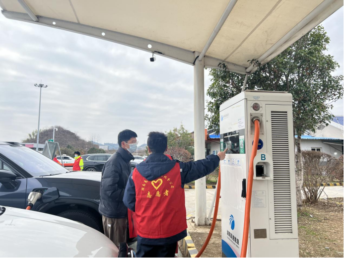 大年初三,外出旅游獲探親訪友的車輛越來越多,考慮到許多司乘人員對充電樁使用生疏,為更好服務(wù)司乘朋友,縮短排隊(duì)充電時(shí)間,新晃片區(qū)管理所“路燈”志愿者們一早來到新晃服務(wù)區(qū),在電動車充電樁處設(shè)置服務(wù)臺,對前來充電的司乘人員進(jìn)行教學(xué)示范,保障其快速充電,并送上新年祝福。