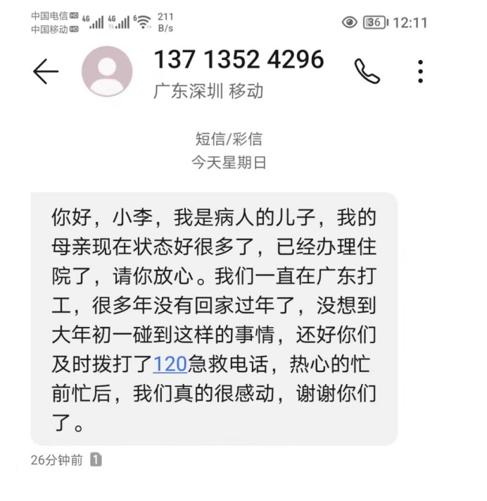 待老人各項(xiàng)體征平穩(wěn)后,收費(fèi)班長李高強(qiáng)收到了一條感謝短信,對收費(fèi)站的暖心幫助表示感謝。