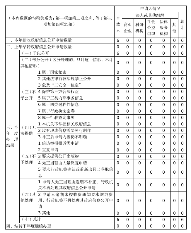 全年收到6件信息公開(kāi)申請(qǐng),均已按時(shí)辦結(jié)。在行政復(fù)議、訴訟方面,也未收到有關(guān)政府信息公開(kāi)的行政復(fù)議申請(qǐng),也未發(fā)生關(guān)于政府信息公開(kāi)的行政訴訟案件。