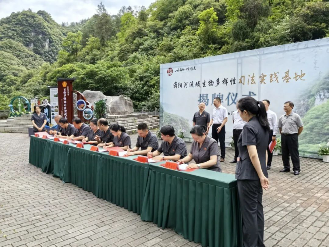 6月5日是世界環(huán)境日,新晃縣人民法院黨組書(shū)記、院長(zhǎng)楊琳慧帶隊(duì)與貴州省鎮(zhèn)遠(yuǎn)縣、甕安縣、黃平縣、施秉縣、岑鞏縣、玉屏侗族自治縣、銅仁市碧江區(qū)人民法院在貴州省鎮(zhèn)遠(yuǎn)縣下?陽(yáng)河景區(qū)游客服務(wù)中心廣場(chǎng)開(kāi)展“?陽(yáng)(水)河流域生物多樣性司法實(shí)踐基地”揭牌活動(dòng),并共同簽署了《?陽(yáng)(水)河全流域環(huán)境資源跨省州縣司法保護(hù)協(xié)作機(jī)制》。