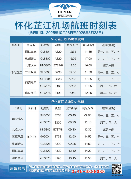 此外,提醒各位旅客,航班信息可能會變化,請以實際購票信息為準,如遇到相關乘機問題,歡迎撥打懷化芷江機場咨詢電話:0745-6838088。